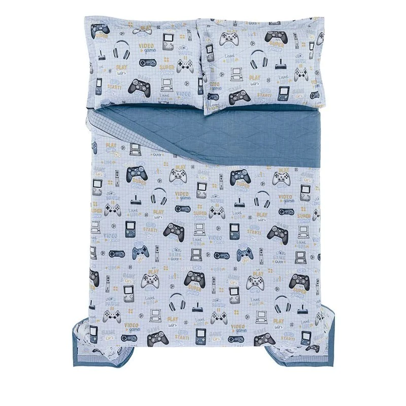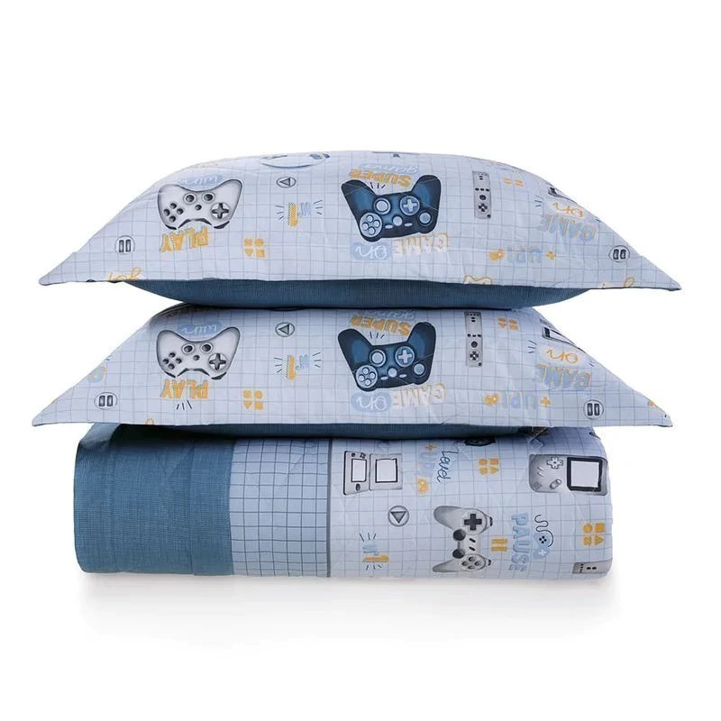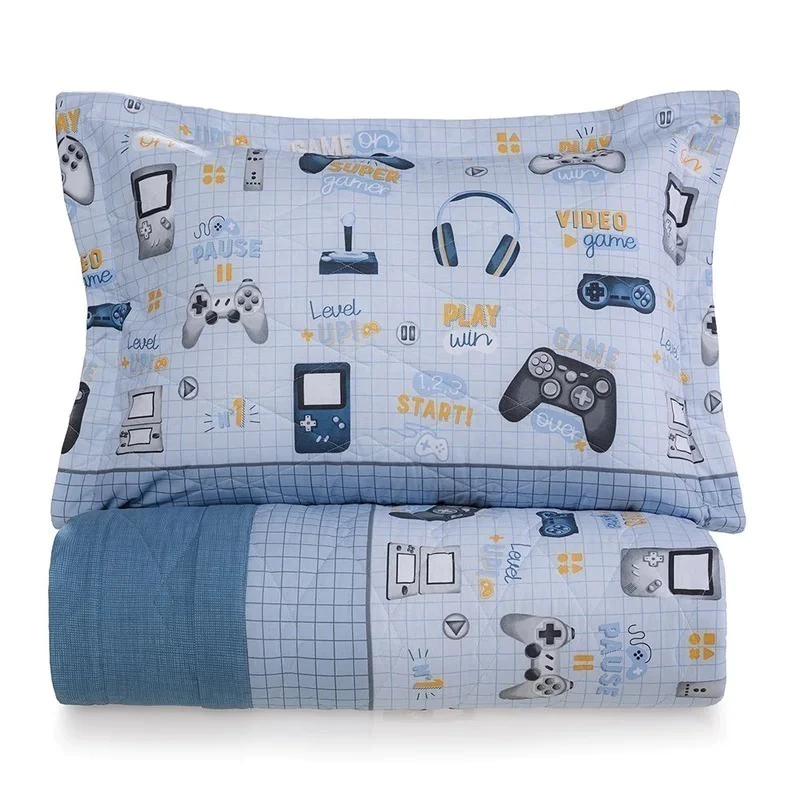O Cobre Leito c/ Porta Travesseiros Diversão Karsten possui estampa de games e é super legal para crianças que adoram jogos e muitas emoções, além de ser bonito e moderno com qualidade impecável. Tem um estilo imponente, tornando a cama bonita e aconchegante. O toque do tecido 100% algodão 180 fios transforma a noite de sono ainda mais agradável do seu pequeno(a), possuindo estilo dupla face com cantos quadrados e porta travesseiro com 3 abas de 5cm.