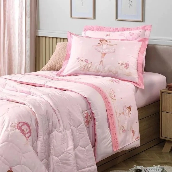 Apresentamos o Edredom Solteiro Infantil Ballet Karsten, uma peça encantadora que traz a magia do ballet para o quarto das crianças. Na sofisticada cor Rosa, este edredom dupla face matelassado é adornado com uma estampa graciosa que inclui bailarinas dançando sobre nuvens, trajes de ballet, carruagens celestiais e mini estrelas. Cada lado do edredom oferece um visual encantador, permitindo variar a decoração conforme desejado. Confeccionado 100% em algodão, este edredom proporciona um toque suave e aconchegante, garantindo noites de sono confortáveis e tranquilas. Ideal para pequenas sonhadoras, o edredom Ballet transforma a hora de dormir em um momento de beleza e fantasia.