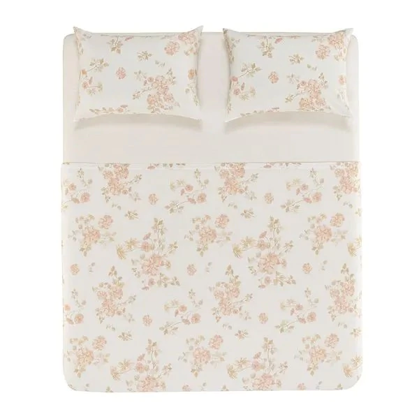 Jogo de Cama Casal Thalia 4 peças, confeccionado em 100% algodão 160 fios, combina qualidade e conforto para noites tranquilas. Com tecido altamente respirável, hipoalergênico e antipilling, oferece maciez e durabilidade, além de ser bem encorpado, garantindo uma sensação aconchegante ao toque. O conjunto inclui um sobre lençol estampado de 2,20m x 2,40m em branco e rosa, um lençol com elástico estampado de 1,38m x 1,88m x 30cm para perfeita fixação no colchão e duas fronhas 50cm x 70cm sem abas, que completam o visual sofisticado. Ideal para harmonizar com peças da mesma linha ou tonalidade, o Jogo de Cama Thalia é perfeito para quem busca elegância e praticidade.