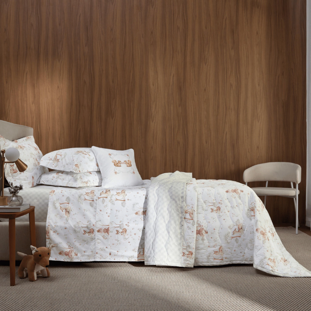 O Jogo de Cama Infantil Trussardi Amici é encantador, em seus detalhes são desenhados animais super divertidos, em cores frescas e doces.