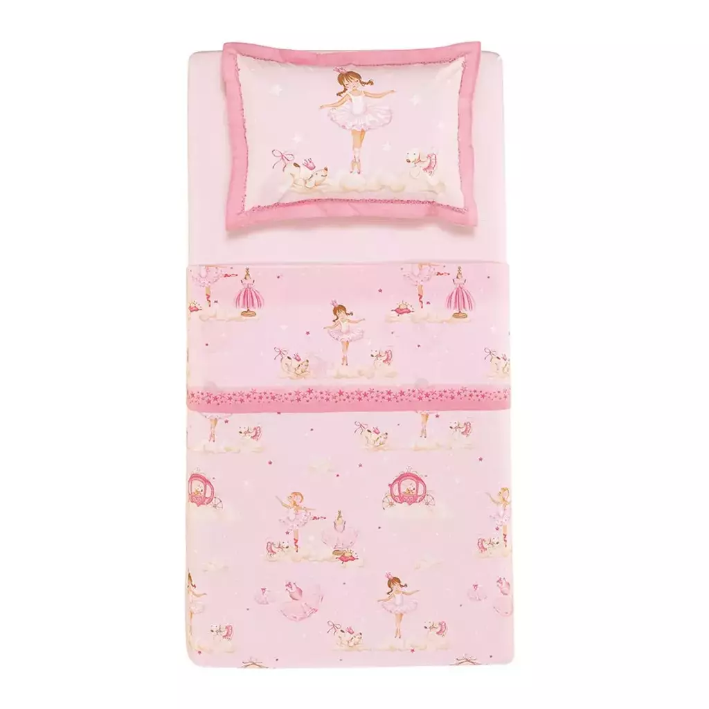 | Combinação de Cores | Fundo rosa com estampa dimensionada na fronha e rotativa no sobre lençol retratando a bailarina e seus cães com tons de rosa e marrons. O Lençol de elástico em xadrez branco com rosa |