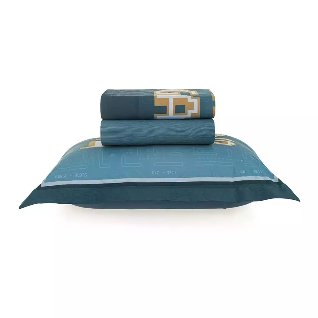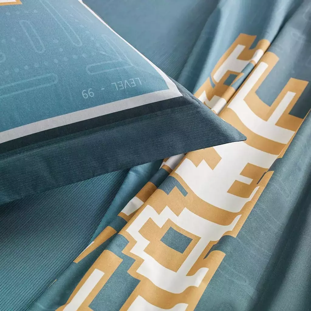 O Jogo de Cama Infantil Game Solteiro oferece diversão e conforto para o quarto dos pequenos. Composto por sobrelençol de 1,80m x 2,50m, lençol de elástico de 1,0m x 2,0m x 35cm e fronha de 50cm x 70cm, ele é confeccionado em 100% algodão com 200 fios, garantindo maciez ao toque e qualidade superior. O sobrelençol apresenta dobra feita que agrega praticidade e elegância, enquanto o lençol de elástico possui uma estampa rotativa que se ajusta perfeitamente ao colchão. A fronha com 3 abas de 5 cm complementa o visual lúdico. Com estampa azul vibrante, esse conjunto cria um ambiente acolhedor e cheio de energia, ideal para estimular a imaginação.