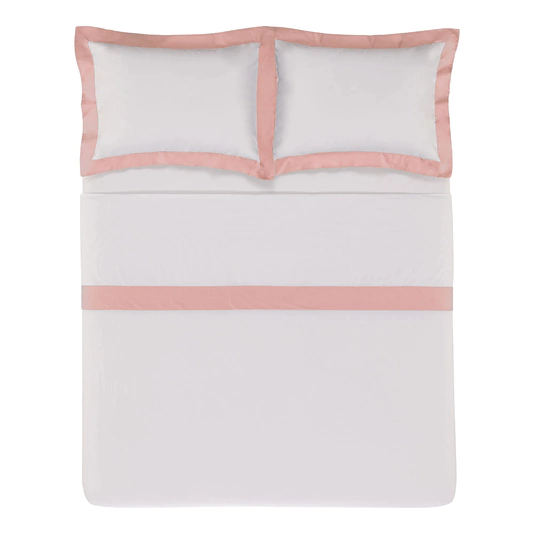 Percal 200 fios; Fronhas 4 abas; Abas tintas; Dobra feita; Lençol com elástico.