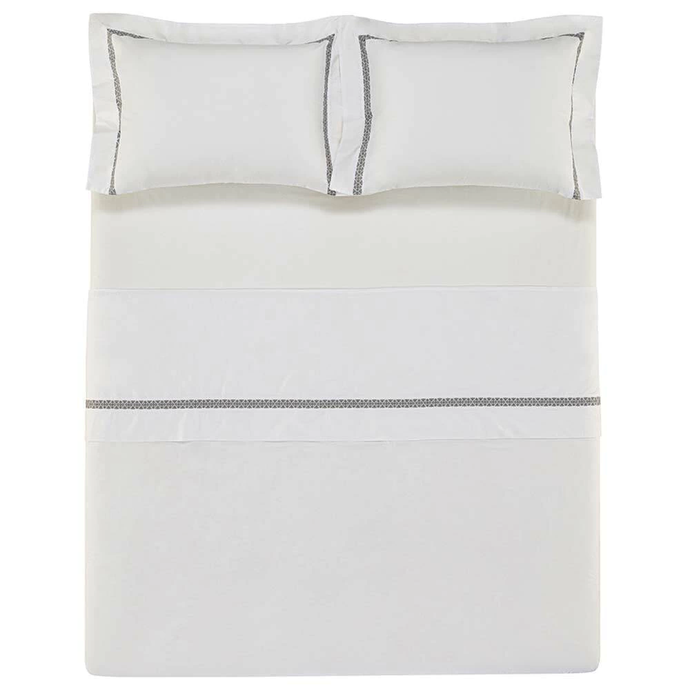 O kit é composto por lençol dobra feita com entremeio bordado, lençol com elástico e par de fronhas 3 abas e entremeio bordado. Perfeito para vestir sua cama!