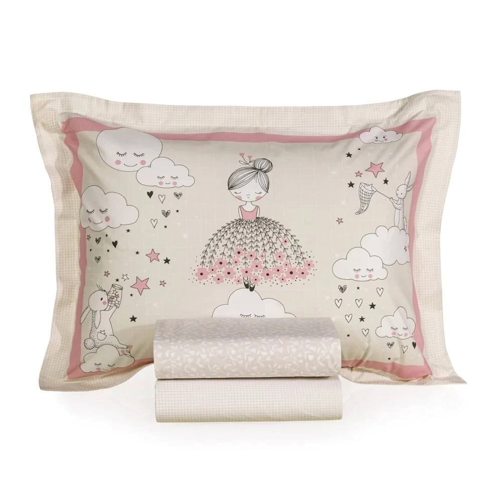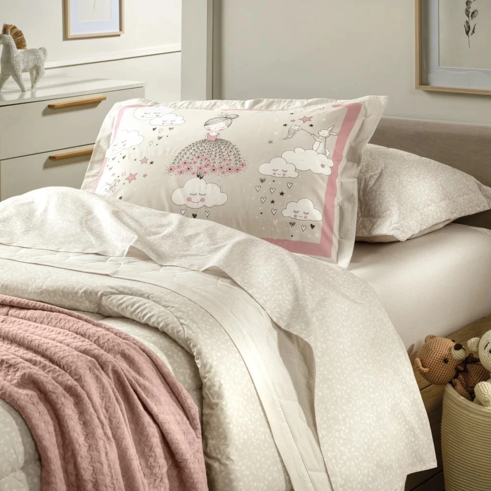 O Jogo de Cama Solteiro Infantil Karsten Lari III é feito em 100% algodão percal 200 fios, oferecendo uma sensação de suavidade e aconchego ao toque, ideal para noites de descanso tranquilas. O conjunto traz um universo encantador e lúdico, com desenhos delicados que inspiram os sonhos das pequenas.