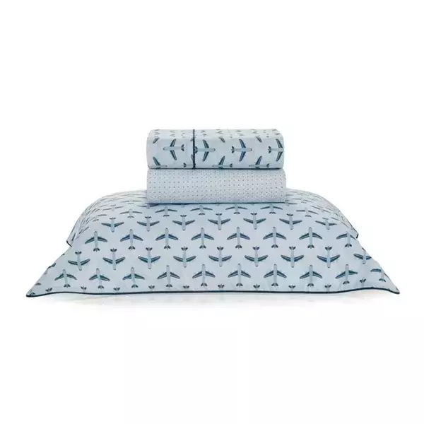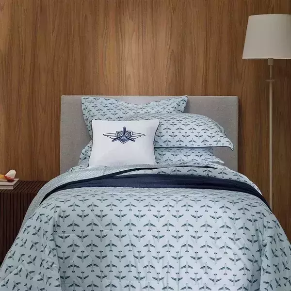 O jogo de cama infantil Volare traz peças lúdicas que abrem espaço para a imaginação ir às alturas com estampa de aviões voando pelo infinito céu azul. Suas cores vivas são capazes de envolver em meio a energia e dinamismo, assim como uma alegre brincadeira de criança. Confeccionada em 200 Fios Percal e 100% Algodão oferece toque suave e confortável para noites relaxantes.